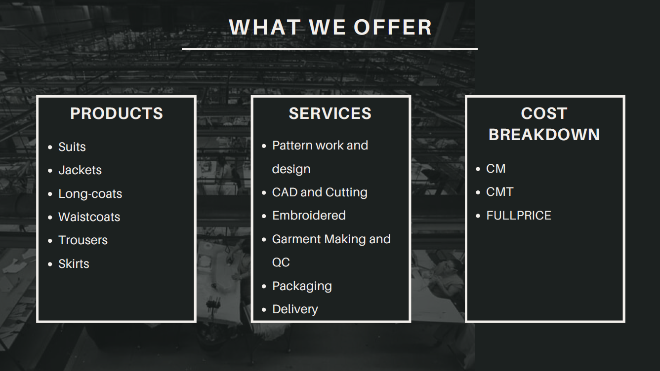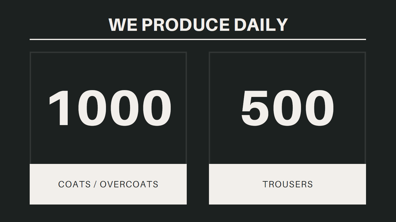 Started as a small family business, today we count with more than 330 workers, distributed by our five factories: three production lines dedicated to jackets/coats, one highly capable trouser line, and one of the best textile cutting facility in the country. Over the years we have been recognized by our honesty, quality and stability. Every day, we make a united effort to improve, based on cutting edge Gerber® CAD technology, automatic cutting equipment, and more recently investments have been made in quality control. As a group, we are passionate by what we do, we give our best every day to provide the finest service to our clients, and we look forward for the next 40 years.